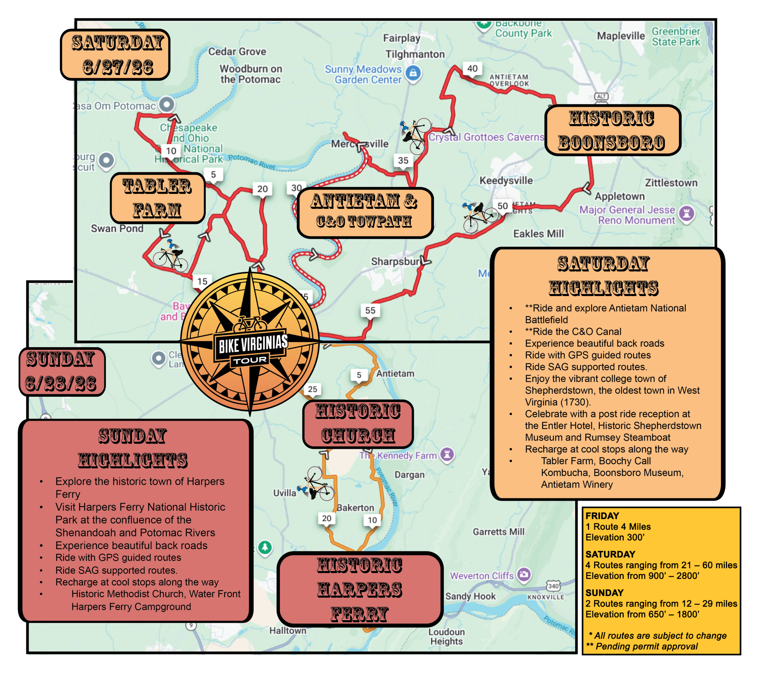 “Looking to stretch your legs after checking in on Friday? Hop on our Friday route to tour the town of Shepherdstown. This short route is a great way to check out our wonderful host town and make sure the bike is working well before the weekend of riding begins.”